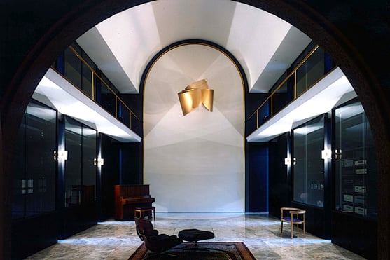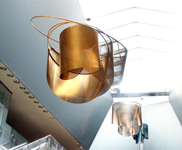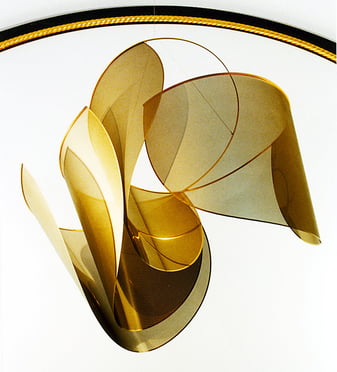 オペラの華やかさを花びらにたとえ、宙に浮いているかのごとく表現したい。このオブジェは「風も通す光も透す」ステンレスを実現した作品です。1枚の花びらサイズ1000x1700mmの極薄ステンレス板(厚み0.3mm)に精密加工専門メーカーで微細な孔を無数に開け、ノイエス/チタンゴールド色を付けて4枚の花びらを制作しました。1993年にオーナーのオペラホールに設置された「花信風」は空気の対流で密かに回転し、ステンレスは風に舞う花びらとなりました。