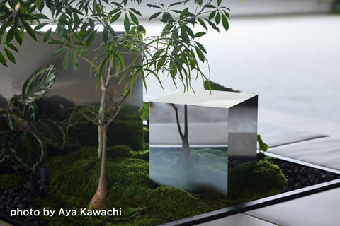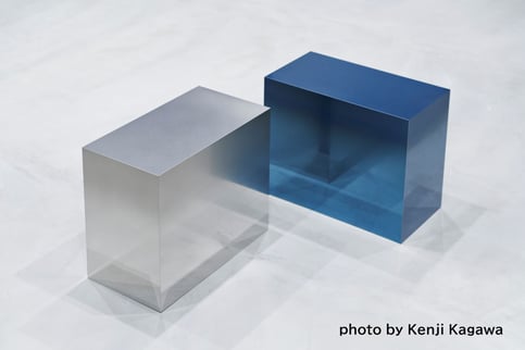 霧や雨など、空や大気の自然をテーマにデザインしたステンレス製のスツール。鏡面仕上げステンレス板を部分的にバイブレーション研磨加工やヘアライン研磨加工してグラデーションの質感を作り、ノイエス/オーシャンネイビー色をつけて、無機質で冷たい印象を持つステンレスを柔らかな表情を持つ素材へと変化させました。それぞれの面の柄が綺麗に繋がるように造形設計し、手作業で仕上げました。さらに、表面に指紋が付きにくい防汚コーティングのファインガード3を鏡面部分以外に施しています。