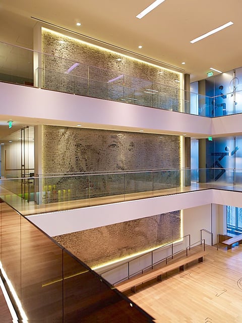 A wall panel was made of photo etching on Fine Color black. 10 x 8m wide panel, Albert Einstein portraiture consists of 11,000 student photos of 100x100mm. This building was awarded as the best design building at Oregon region of the US architectural organization in 2010.