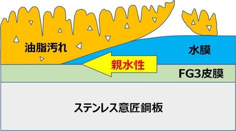 親水性のファインガード3は付着した油汚れとの間に水が浸透して汚れを浮き上がらせるので、容易に拭き取れます。